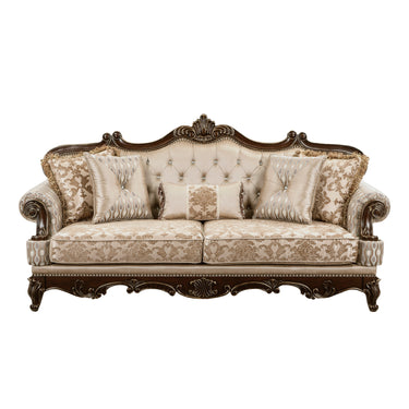 An elegant combination of traditional elements is paired to create the timeless look of the Balthasar Collection. The eye-catching design of the base and top rail of the sofa features a cherry finish with gold tipping, the elegant detail a perfect pairing to the complementing contrast of the patterned brown chenille fabric upholstery. Faux crystal-tufted, and trim detailed, the sofa also features five coordinating toss pillows. Furthering the traditional aesthetic are the round arms and contoured arm fronts.