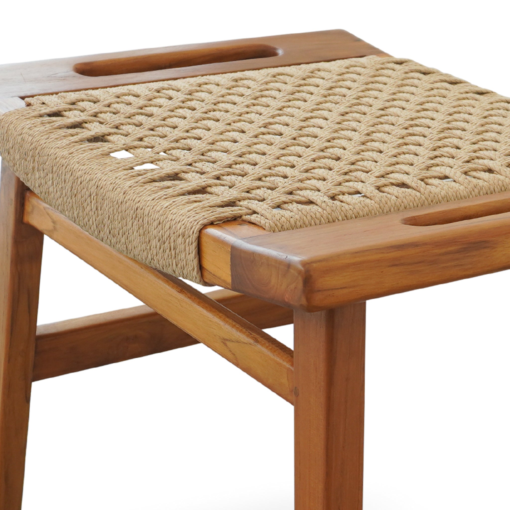 Experience the allure of our Rustic Mid-Century Modern Accent Stool, whose organic and minimalistic style will go in perfectly with any living area. This stool is made from solid wood that has been kiln-dried, and its smooth, organic surface brings out the wood's beauty. With a ventilated, woven pattern seat composed of sturdy paper rope for maximum comfort and durability, its rectangular design is both fashionable and practical.The design of the stool features front, back, and side stretchers as well as outward-angled tapered legs, which provide stability and a lightweight profile that makes it simple to maneuver around your house. This stool is quite versatile due to its small size; it can be used as a footrest, side table, or extra seating.