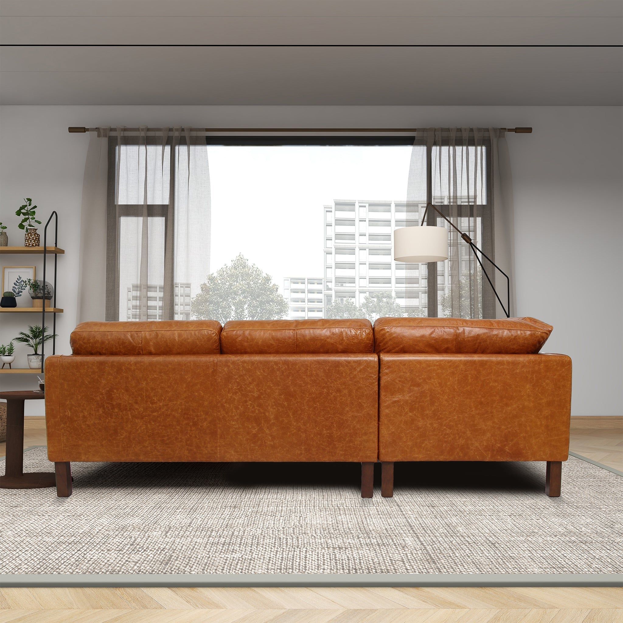 Designed for pleasant discussion, the Juno Sectional Leather Sofa is the ideal combination of sophistication and elegance. Its rich wax and oil finish and 100% buffalo aniline-dyed leather upholstery highlight the natural color variations for a distinctive, classic style. Maximum comfort is provided for both sitting and sleeping thanks to the deep seat and strong foam-filled cushions. Cleaning is made simple by the high-leg design. This sofa is long-lasting and environmentally friendly because it is made from sustainable wood and complies with CARB and TB117 regulations. It is a fantastic complement to any living room because it is quick and simple to assemble.