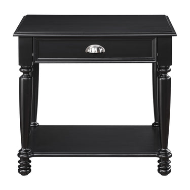 Providing decorative function to your casual traditional living room is the Sanders Collection. The end table has a black finish with traditional accenting of turned legs, cup hardware, display shelf and functional drawer that lend to the classic design.