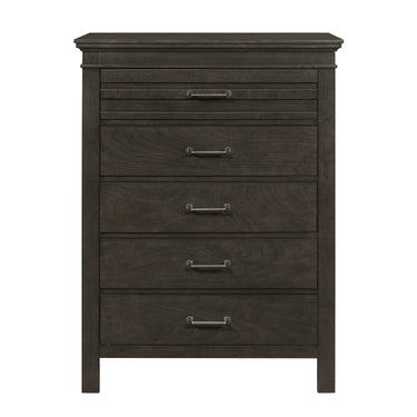 The transitional styling of the Blaire Farm Collection serves as the perfect complement to the rustic aesthetic that inspired the design. The okume veneer is enhanced by the charcoal gray finish that covers the chest. Fixed handle pull hardware fronts the drawers while horizontal accent on the top drawer lends visual contrast.