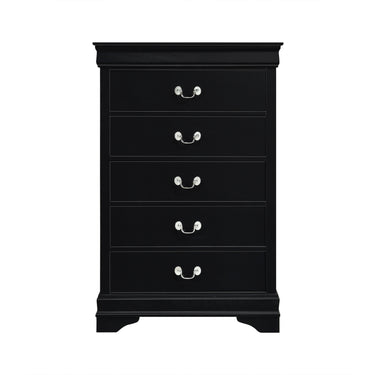 Traditional in design and modest in scale, the elegant Mayville Collection takes its design inspiration from the classic Louis Philippe styling. The Okume veneer of the chest is paired with a black finish and is accentuated by antique nickel tone drop handles.