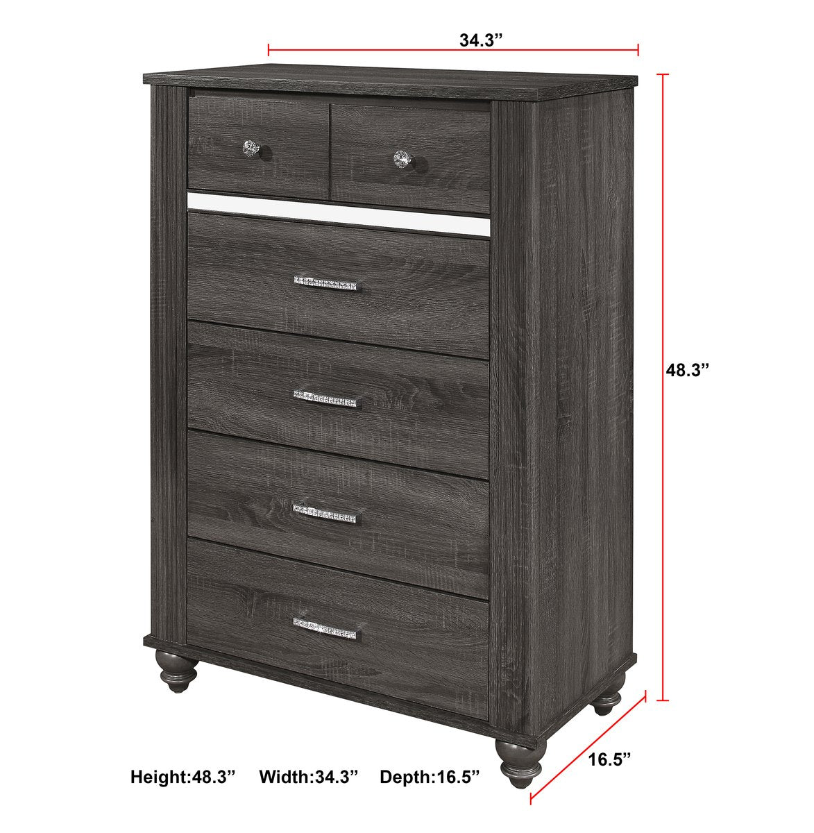 The Crown Mark GRey Gaston Bedroom Set is available in queen or king size and includes the headboard, footboard, rails, dresser, mirror, chest, and nightstand.  Neither a mattress nor mattress box foundation is included with the purchase of this bedroom set.  This elegant and modern style bedroom set comes with a  dresser comes with a large mirror attached on top and seven drawers  The chest comes equipped with six drawers. The nightstand comes with two drawers. Assembly required. Boxspring required.