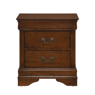 Traditional in design and modest in scale, the elegant Mayville Collection takes its design inspiration from the classic Louis Philippe styling. The Okume veneer of the nightstand is paired with a brown cherry finish and is accentuated by antique brass tone drop handles.
