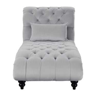 The exquisite glamour that accents your home will pair perfectly with the Rosalie Collection. The dramatic curves of the chaise give way to traditional accent in the form of rolled arms, button-tufting, turned legs -with black finish- and nailhead trim. The velvet covering of the collection is offered in light gray to perfectly complement your living space.