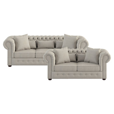 2 Piece beige chesterfield fabric linen blend timeless sofa. Includes sofa and loveseat pillows included tufted upholstery