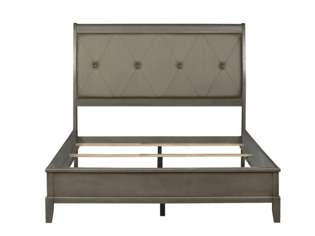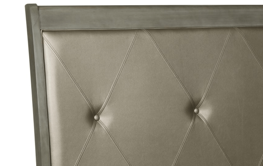Gray finish over birch veneer, black or gray bi-cast vinyl insert with x-stitching and button-tufting.