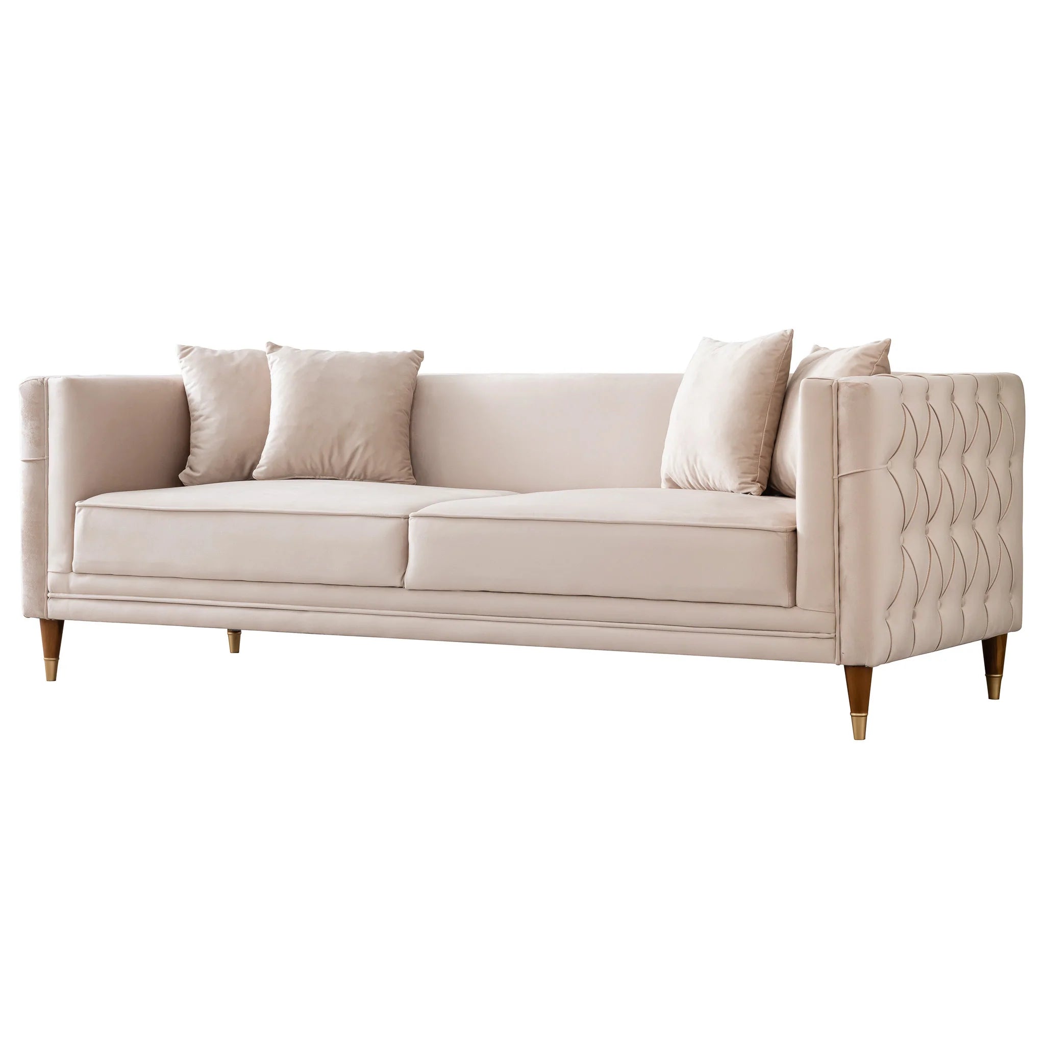 Upgrade your space with the Edward Light Cream velvet sofa, a stunning example of mid-century modern style. Crafted with top-quality materials and high-density foam, this sofa offers both durability and superior comfort, making it the perfect centerpiece for your living room, den, urban loft, condo, or home office. The luxurious velvet upholstery adds a touch of elegance, and it's easy to clean with a non-abrasive solution and a microfiber cloth. Plus, the removable legs make delivery a breeze, even in tight spaces. With a variety of timeless colors available, you're sure to find the perfect match for your decor.